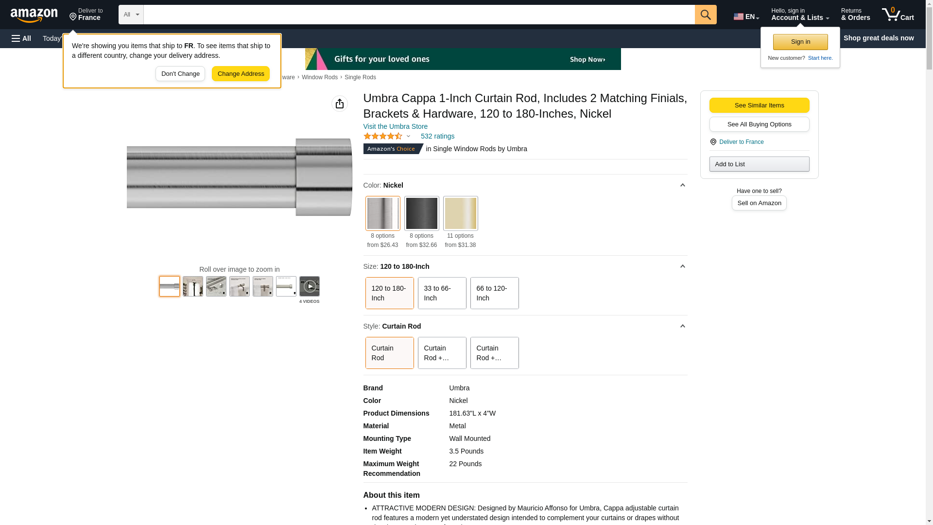Umbra Cappa 1-Inch Curtain Rod, Includes 2 Matching Finials, Brackets & Hardware, 120 to 180-Inches, Nickel