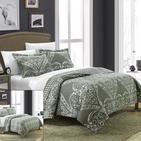 CHDE1736 <br /> <b>Features</b> <br /> <ul> <li>Set includes 1 quilt, 2 shams, 1 flat sheet, 1 fitted sheet and 2 pillow cases</li> <li>Style: Contemporary</li> <li>Fabric detail: Jacquard</li> <li>Pattern: Floral</li> <li>Materials: Polyester</li> <li>Fill material: Polyester fill</li> <li>Product Type: Quilt/Coverlet set</li> <li>Pattern: Solid/Damask</li> <li>Material: Polyester</li> <li>Number of Items Included: 7</li> <li>Cleaning Method: Machine washable</li> <li>Style (Old): Contemporary</li> </ul> <br /> <b>Dimensions</b> <br /> <ul> <li>Sham flange size: 2"</li> <li>Flat sheet hem size: 4"</li> <li>Overall Product Weight: 8 lbs</li> </ul> <br />Size Queen <br /> <ul> <li>Flat Sheet Length - Head to Toe: 102"</li> <li>Flat Sheet Width - Side to Side: 90"</li> <li>Fitted Sheet Length - Head to Toe: 80"</li> <li>Fitted Sheet Width - Side to Side: 60"</li> </ul> <br />Size King <br /> <ul> <li>Flat Sheet Length - Head to Toe: 108"</li> <li>Flat Sheet Width - Side to Side: 102"</li> <li>Fitted Sheet Length - Head to Toe: 80"</li> <li>Fitted Sheet Width - Side to Side: 78"</li> </ul>