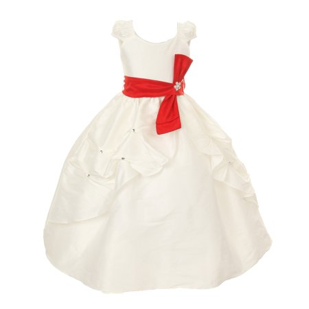 <ul> <li>Stunning, elegant white dress perfect for pageant or any special occasion</li> <li>Features cap sleeves and a pick up long skirt</li> <li>Red belt with a bow featuring a stone brooch pin</li> <li>Glittery rhinestone accents on the skirt. Ankle length</li> <li>Sizing is based on U.S. clothing size standards</li> </ul>