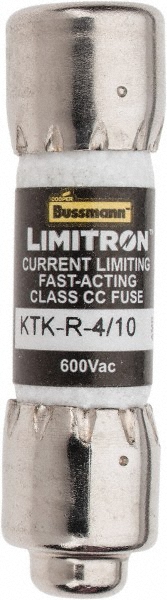 'Fuse, 4/10A Fuse Amps, Nonindicating, KTK-R Series, 600VAC Fuse Voltage Rating, Fast Acting, CC Class, Single Element, Body Material Melamine, Rejection, Body Style Cylindrical, Fuse Interrupt Rating 200kA at 600VAC, Length 1-1/2 In., Diameter 13/32 In., Functionally Equal To Mersen/Ferraz Shawmut ATMR, Littelfuse KLKR, Standards CE/UL-248-4 Guide JDDZ/CSA Class 1422-02'