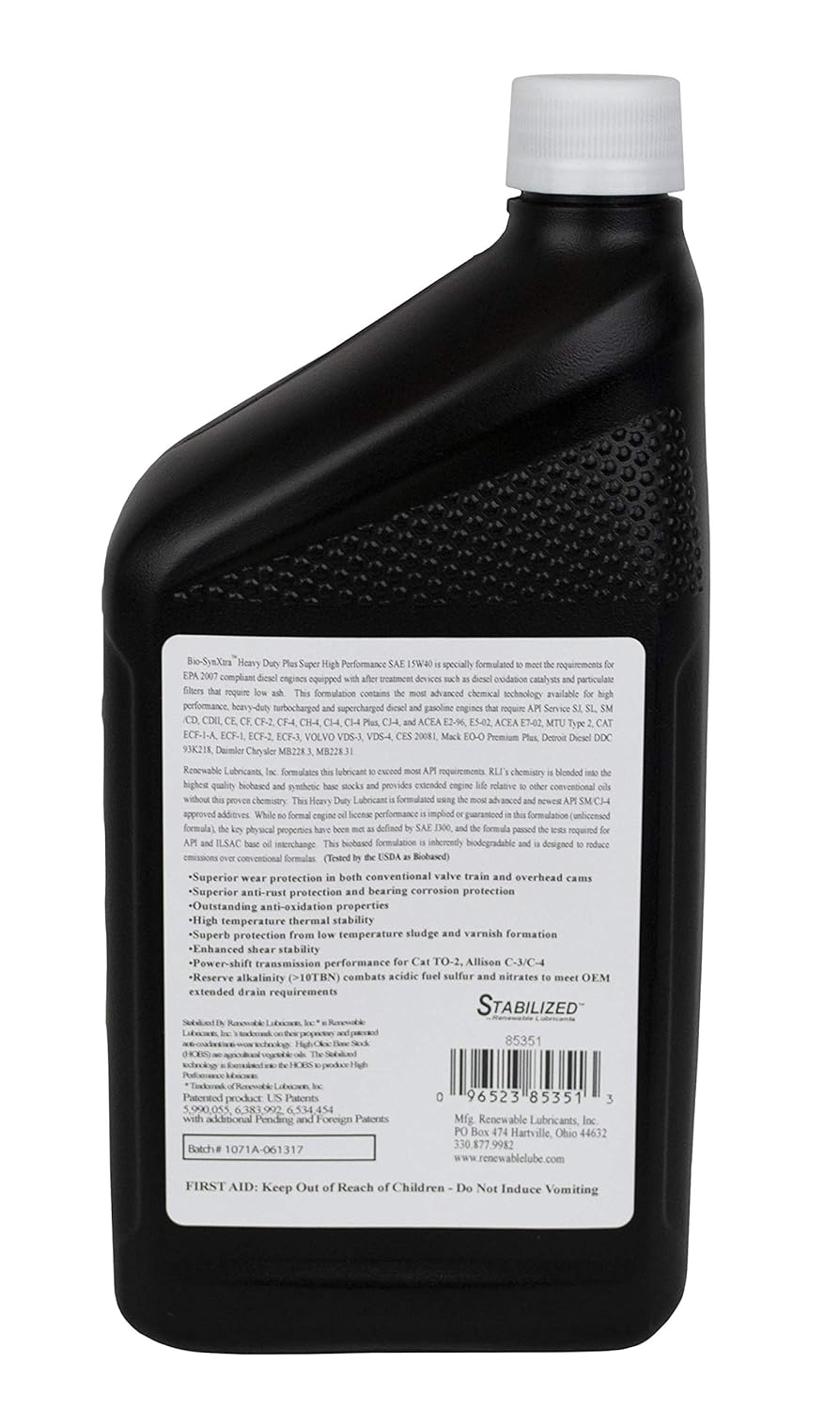Renewable Lubricants Bio-SynXtra heavy duty plus super high performance motor oil SAE 15W40 is specially formulated to meet the requirements for EPA 2007 compliant diesel engines equipped with after treatment devices such as diesel oxidation catalysts and particulate filters that require low ash. This patented formulation contains the most advanced chemical technology available for high performance, heavy-duty turbocharged and supercharged diesel and gasoline engines that require API Service SJ, SL, SM, SN/CD, CDII, CE, CF, CF-2, CF-4, CH-4, CI-4, CI-4 Plus, CJ-4, and ACEA E2-96, E5-02, ACEA E7-02, MTU Type 2, CAT ECF-1-A, ECF-1, ECF-2, ECF-3, VOLVO VDS-3, VDS-4, CES 20081, Mack EO-O Premium Plus, Detroit Diesel DDC 93K218, Daimler Chrysler MB228.3, MB228.31. Renewable Lubricants formulates this lubricant to exceed most API requirements. RLI's patented chemistry is blended into the highest quality biobased and synthetic base stocks and provides extended engine life relative to other conventional oils without this proven chemistry. Power-shift transmission performance for Cat TO-2, Allison C-3/C-4. SAE grade: 15W40.