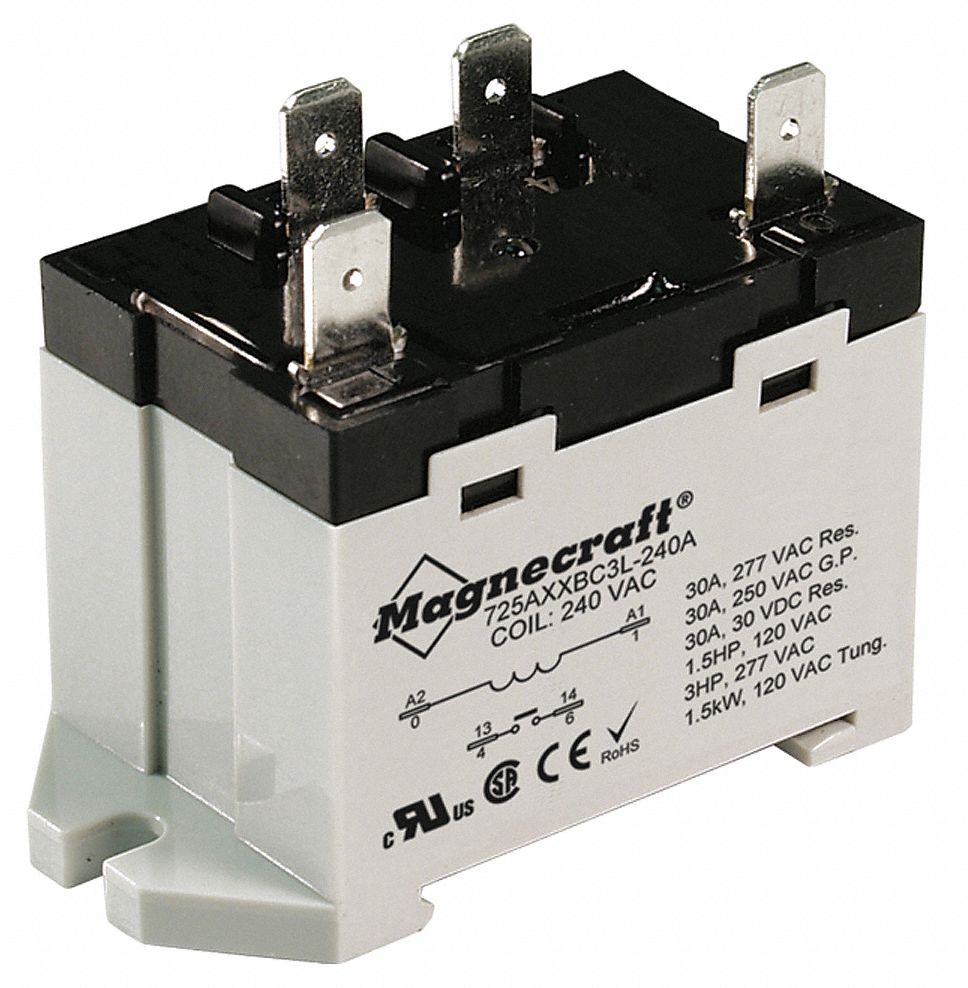 Featuring top-mounted screw terminals and silver alloy contact material, this relay has a flange-type mounting bracket.<br /><br /> Item - Relay: Enclosed Power Relay<br /> Coil Volts: 240VAC<br /> AC Contact Rating - Relay: 30A @ 277V<br /> DC Contact Rating - Relay: 30A @ 28V<br /> Number of Pins - Relay: 4<br /> Contact Form - Relay: SPST-NO<br /> Mounting - Relay: Bottom Flange, DIN Rail<br /> Power Consumption - Relay: 2.5VA<br /> Contact Material: Silver Alloy<br /> Electrical Connection - Power Relay: 1/4" Tab Terminal<br /> Socket Code - Relay: M<br /> Body Height - Relay: 1.94"<br /> Body Width - Relay: 2.67"<br /> Body Depth - Relay: 1.30"<br /> Overall Height - Relay: 1.94"<br /> HP @ 120V: 1-1/2<br /> HP @ 240V: 3<br /> Hz - Electrical: 50 Hz, 60 Hz<br /> Features: LED & Button, 3HP @ 277VAC<br /> Standards: cURus/CSA/CE