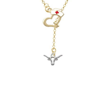 Silver Tone Mini Longhorn Head Outline Gold Tone Nurse Hat Heart Lariat Necklace. Silver Tone, hand enameled charms. Charm size is approx. 0.41 x 0.62 x 0.06 inches (HxWxD) including loop. Open Heart with Nurse Hat is approx. 0.68 x 0.71 x 0.13 inches (HxWxD). Great graduation gift or just to show your appreciation. Necklace is 18 inches. 2mm Rolo Chain with lobster claw clasp. We are a family owned company for over 35 years in the U.S.A. Designs are exclusive to Delight & Co. PLEASE NOTE: Our products are lead safe, but are not intended for children 14 years and younger.
