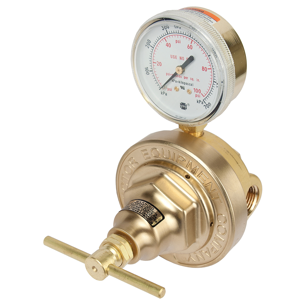Victor 0780-1199 L 700 Series Extra heavy-duty LP Hydrogen Gas High Volume Line Regulator offers 4 - 80 and 5 - 125 PSIG delivery range. Regulator with 1/2" NPT F inlet and outlet ports has stem type seat mechanism for magnificent durability. 2 1/2" Forged brass body regulator has housing cap with delrin cap bushing to provide smooth adjustments. It is ideally designed for use with gas distribution system that comes with either 1/2" NPT F or 3/4" NPT F inlet ports. It has 3 1/4" neoprene diaphragm with maximum 350 PSIG inlet pressure that is not suitable for use on cylinders.. Victor offers high performance products for non-cylinder applications such as automated cutting, bulk gas system delivery and other pipeline applications where high flow maintaining consistent pressure is critical. WARNING: Not or Use On Cylinders. Design/Construction, Forged brass body and housing cap. 2.5" gauge - brass. Stem type seat mechanism. 3.25" diaphragm - fabric-reinforced neoprene. Delrin cap bushing for smooth adjustments. Designed for gas distribution system (pipeline). Available in either 1/2" NPT 9F) or 3/4" NPT (F) inlet.