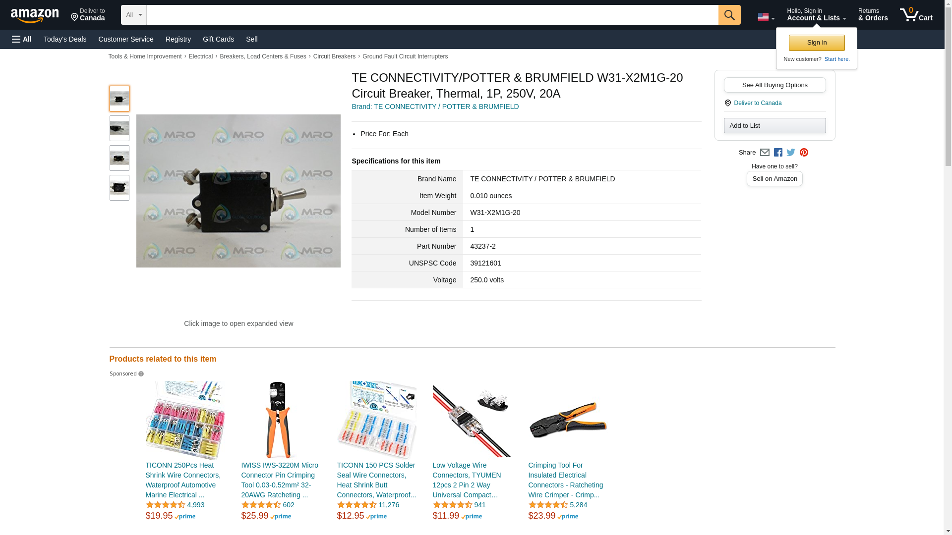 TE Connectivity / P&B Brand W31-X2M1G-20, 20 Amp Toggle Circuit Breaker