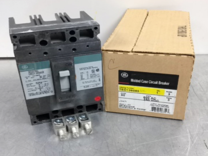 GE TED136080WL molded case switch, thermal magnetic; ted frame; 600 vac; 80 ampere; 3 pole; interrupting rating 200 kiloampere at 240 vac, 100 kiloampere at 480 vac, 65 kiloampere at 600 vac; terminal aluminum/copper line lug, load lug; approval ul