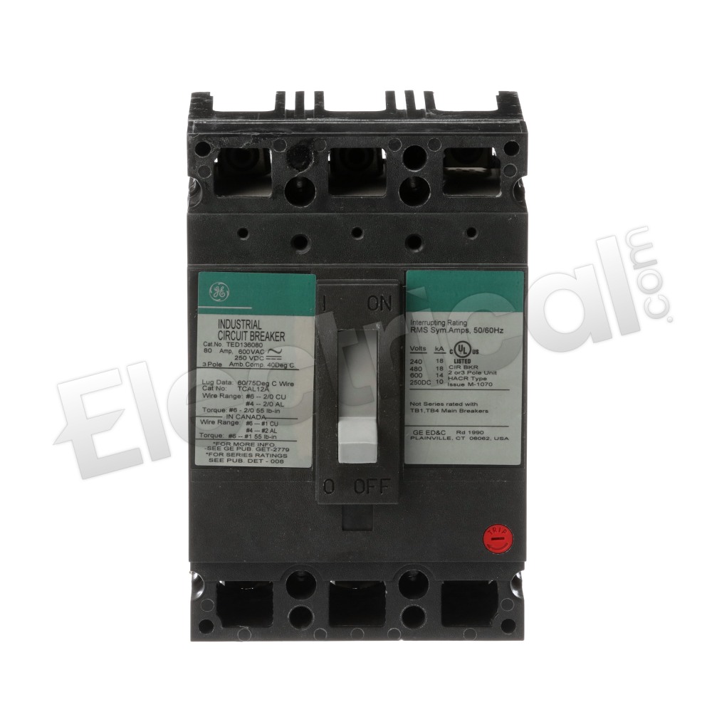 Molded Case, Fixed Thermal Magnetic; Ted Frame; 240/480/600 Vac, 500 Vdc; 80 Ampere; 3 Pole; Interrupting Rating 18 Kiloampere At 240/480 Vac, 14 Kiloampere At 600 Vac, 10 Kiloampere At 500 Vdc; Terminal Aluminum/copper Line Lug, Load Lug; Size 4 1/8 Inch W X 3 3/8 Inch D X 6 5/16 Inch H; Approval Ul; Ted Model