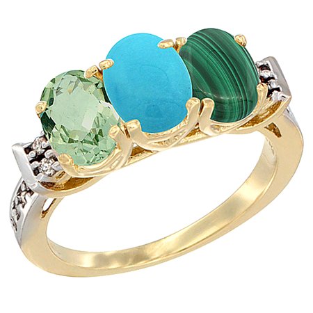 14K Yellow Gold Natural Green Amethyst, Turquoise & Malachite Ring 3-Stone 7x5 mm Oval Diamond Accent, sizes 5 - 10
