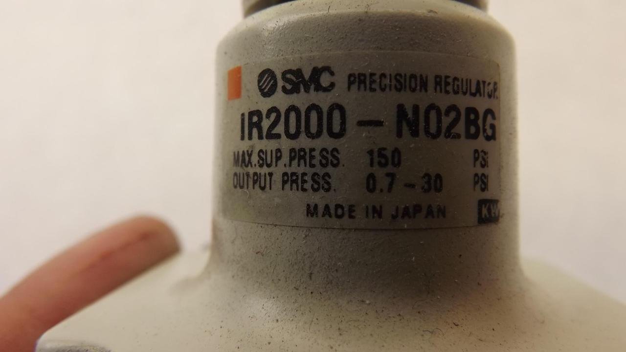 From our inventory we are selling an SMC Pneumatic Regulator. Specifications: Model #: IR2000-N02BG More Information: Input Pressure (max): 150 PSI Output Pressure: 0.7-30 PSI Port Size: 1/4" NPT Gauges May Vary
