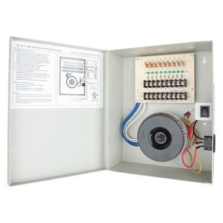 Power Supply, Number of Channels 18, Overall Height 10 1/4 in, Overall Width 10 5/8 in, Overall Depth 3 1/8 in, VA Rating 40 VA, Maximum Input Voltage 110/220V AC, Maximum Output Voltage 12V DC, For Use With CCTV Cameras, Input Type No Inputs Included, Output Type No Outputs Included, Color Ivory, Features Lock on Power Outlet Screw, PTC Resettable Fuse, Includes (18) Output Terminal Strip Connections, Standards UL Listed