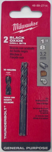 1/8" Thunderbolt Black Oxide Drill Bit Milwaukee thunderbolt black oxide jobber length drill bits are designed for extreme durability and long life. The thunderbolt web features a thicker core than a standard drill bit, which provides ultimate strength and protects against side-load breakage. A specially designed parabolic flute form clears chips and debris fast to keep the bit cool. A precision start, 135 split point tip starts on contact to keep the bit from walking for fast accurate holes. Excellent for drilling on curved surfaces, requires less effort to drill and is highly recommended for use with portable drills. Features: 1/8" Diameter Black Oxide Construction Since its founding in 1924, Milwaukee has focused on a single vision: To produce the best heavy-duty electric power tools and accessories available to the professional user. Today, the Milwaukee name stands for the highest quality, durable and reliable professional tools money can buy.