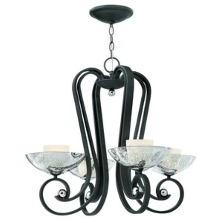 FR40604BKS Features: -Chandelier.-Faux mercury with etched opal inner glass.-c-UL-us certified. Construction: -Steel construction. Specifications: -120 Volts.-Accommodates (4) 60W candelabra bulbs. Dimensions: -Leadwire length: 144''.-Chain length: 120''.-Canopy dimensions: 7.25'' W x 7.25'' D.-Overall dimensions: 25.25'' H x 28'' W. Collection: -Muse collection.