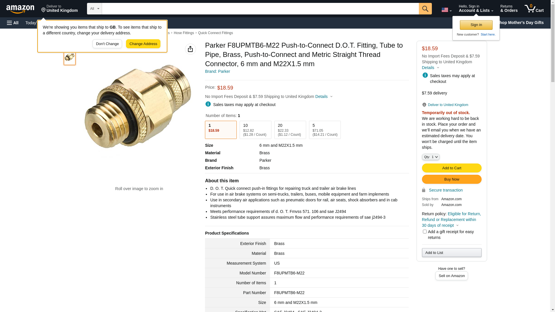 Parker F8UPMTB6-M22 Push-to-Connect D.O.T. Fitting, Tube to Pipe, Brass, Push-to-Connect and Metric Straight Thread Connector, 6 mm and M22X1.5 mm
