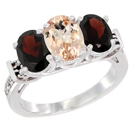 10K White Gold Natural Morganite & Garnet Sides Ring 3-Stone Oval Diamond Accent, sizes 5 - 10