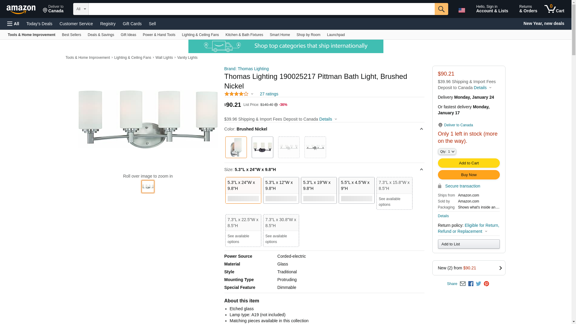 Thomas Lighting 190025217 Pittman Bath Light, Brushed Nickel