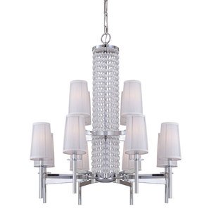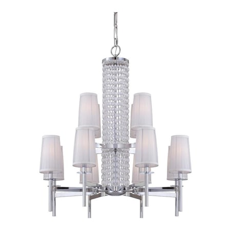 This Twelve Light Up Chandelier is part of the Candence Collection and has a Chrome Finish and Silver Organza Fabric Glass.