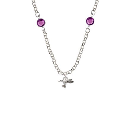 Silver Tone Mini Hummingbird Purple Crystal Fiona Necklace. Silver Tone, hand enameled charms. Charm size is approx. 0.36 x 0.41 x 0.09 inches (HxWxD) including loop. 3mm Belcher Chain with 4 - 6mm Swarovski Crystal Channel Links. Necklace: 20-22 Inches Adjustable with a Lobster Claw Clasp. This beautiful necklace is elegant with a touch a color for a personalized look. We are a family owned company in the U.S.A. since 1977. PLEASE NOTE: Our products are lead safe, but are not intended for children 14 years and younger.
