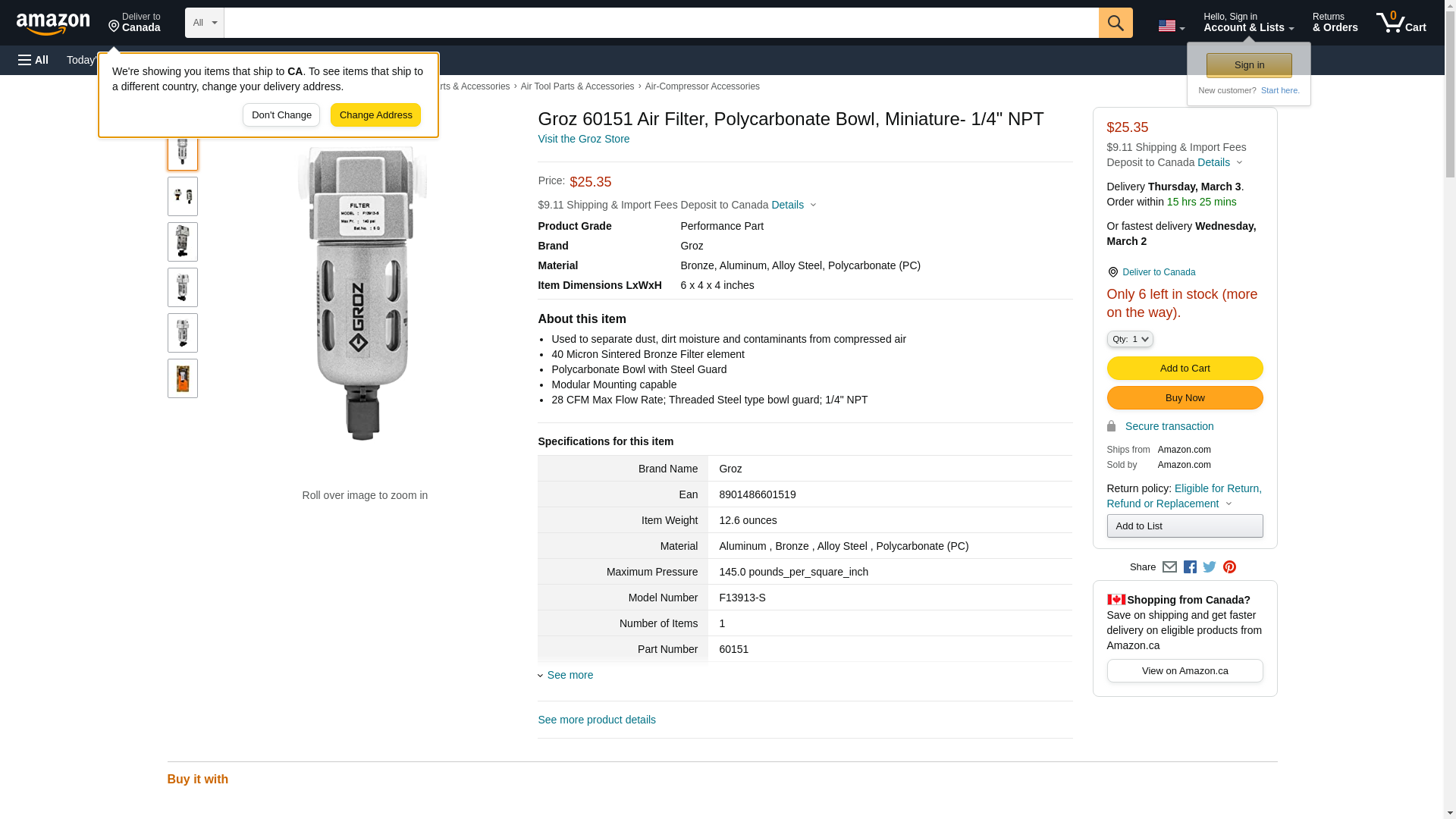 Groz 60151 Air Filter Miniature - 1/4" NPT - 28 CFM