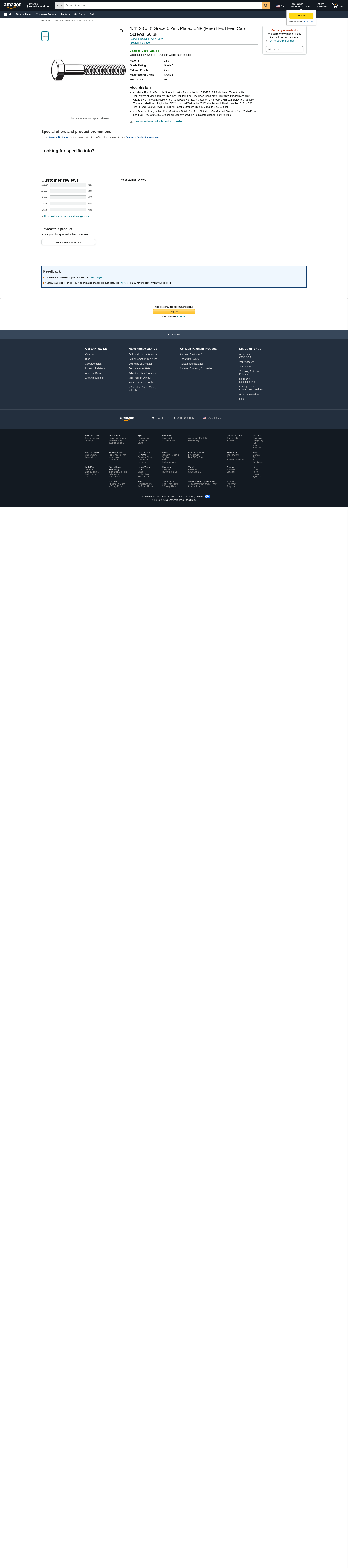 | Feature | <b>Price For:</b> Each <b>Screw Industry Standards</b>: ASME B18.2.1 <b>Head Type</b>: Hex <b>System of Measurement</b>: Inch <b>Item</b>: Hex Head Cap Screw <b>Screw Grade/Class</b>: Grade 5 <b>Thread Direction</b>: Right Hand <b>Basic Material</b>: Steel <b>Thread Style</b>: Partially Threaded <b>Head Height</b>: 5/32" <b>Head Width</b>: 7/16" <b>Rockwell Hardness</b>: C19 to C30 <b>Thread Type</b>: UNF (Fine) <b>Tensile Strength</b>: 105, 000 to 120, 000 psi |