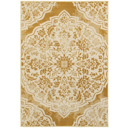 Invoke traditional design elements in your home with this floral medallion area rug. The Oriental design in gold and ivory strikes an understated and elegant note. Synthetic fibers provide durability and softness. <br /> <br /> <ul> <li>Pile Height: Less than 0.25 inch</li> <li>Product Features: Stain Resistant</li> <li>Material: Nylon, Polypropylene, Synthetic Fiber</li> <li>Style: Transitional</li> <li>Pattern: Floral, Oriental</li> <li>Weave Type: Machine-Made</li> <li>Rug Type: Indoor</li> <li>Feature: Contains Latex</li> <li>Shape: Rectangle</li> <li>Color: Ivory, Gold</li> <li>9 feet 10 inches wide x 12 feet 10 inches long</li> </ul> <br /> <br /> <b>Tip: We recommend the use of a <a href="https://www.overstock.com/Home-Garden/Rug-Pads/1285/subcat.html" target="_blank"> <u>non-skid pad</u></a> to keep the rug in place on smooth surfaces.</b> <br /> <br /> <i>All rug sizes are approximate. Due to the difference of monitor colors, some rug colors may vary slightly. We try to represent all rug colors accurately. Please refer to the text above for a description of the colors shown in the photo.</i> <br />