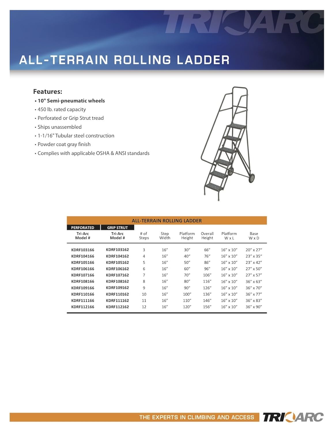 Tri-Arc KDRF111166 11-Step All-Terrain Roll and Fold Steel Industrial & Warehouse Ladder with Perforated Tread