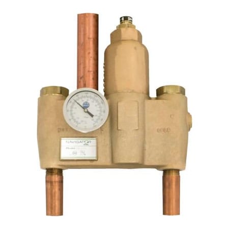 Bradley Navigator Thermostatic Mixing Valve, designed for use in commercial applications.. Valve designed specifically to provide tepid water required for drench shower and eye wash applications. Includes fixed cold water bypass and anti-scald positive shut-off to protect users. Powerful liquid filled thermostat with 10 year warranty insures constant outlet temperature. Provides tepid water as required by ANSI Z358.1. 54 GPM @ 30psi. Certified to ASSE 1071. Rough brass finish. Piped assembly only. Complements Bradley's full line of combination showers and eye wash products. Incoming 1 NPT connections, outlet is 1 1/4 NPT. Dial thermometer. Maximum operating pressure of 125 PSI. Minimum temperature differential of 15 degrees Fahrenheit between incoming hot water temperature and valve set point. Manufactures limited warranty. Product Details GPM @ 30 PSI 61.6 gal/min Temperature Range Max 90°F Max Pressure 180 psi Material Brass Temperature Range Min Z358.1 Color Family Brown Weights & Dimensions Inlet Connection 1-1/4 NPT in Outlet Connection 1 NPT in