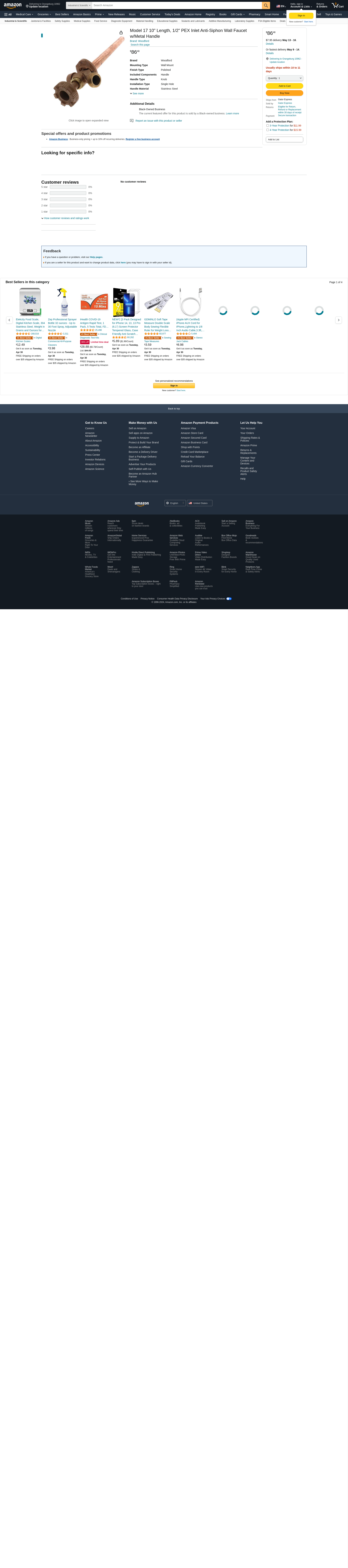 <p><b>Description</b><ul><li>Note: This item offers anti-siphon protection The freezeless Model 17 is designed and intended for year- round residential irrigation purposes regardless of outside temperature. This faucet will not rupture from freezing when the valve is shut off and the hose is removed. The Model 17 contains an integral backflow protection device which protects up to 125 psi of backpressure and therefore does not require and add-on vacuum breaker. Specifications: Manufactured under one or more of the following patents: 3,208,715; 3,278,201; 5,590,679; 5,632,303 ASSE 1019 - Type C Listed CSA, cUPC Approved Features: 1/2" PEX Crimp Inlet 3/4” male hose thread nozzle Stainless steel seat - eliminates wire draw EPDM packing to prevent leaking Full circle operating threads on valve body and retainer No-lead solder Standard “O” size seat washer Powder-coated, die cast aluminum handle Adjustable polycarbonate wall flange Max Pressure: 125 p.s.i. Max Temperature: 120° F</li><li> Size: 1/2" </li><li> Length (Inches): 10" </li><li> Inlet Type: PEX Crimp </li><li> Max Pressure (PSI): 125 </li><li> Max Temp (F): 120°F</li></ul></p>