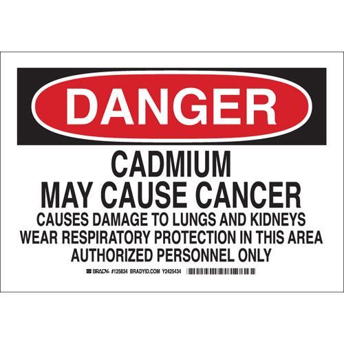 Brady 125833 DANGER Cadmium May Cause Cancer Causes Damage To Lungs And Kidneys Sign - Light Duty Plastic - Black/Red on White - 7 x 10