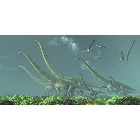 Pteranodon reptiles fly over a herd of Mamenchisaurus dinosaurs in the Cretaceous Era Poster Print