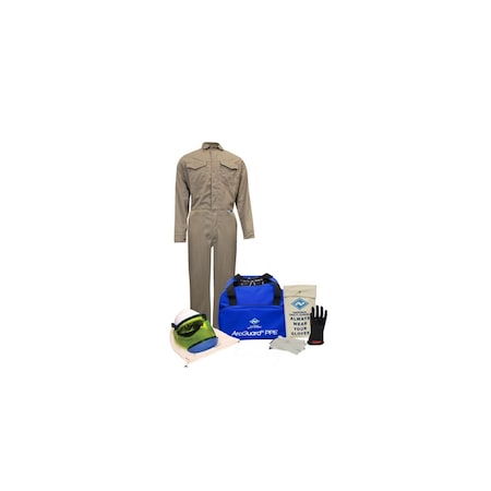 - Kit Includes: FR DuPont Protera Coverall; Hard Hat with Arc Flash Face shield & Chin Cup; Safety Glasses; Class 0 Voltage Rated Gloves; Glove Protectors