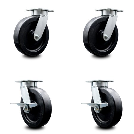 Kingpinless Polyolefin Swivel Top Plate Caster Set of 4 w/8" x 2" Black Wheels - Includes 2 Swivel with Brakes & 2 Swivel - 3600 lbs Total Capacity - Service Caster Brand