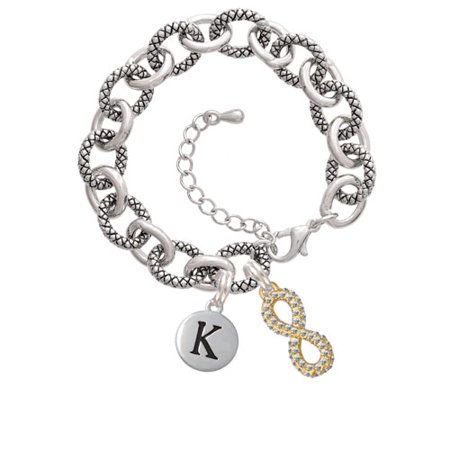 Gold Tone Crystal Infinity Sign -K- Pebble Initial Diana Bracelet. Gold Tone Crystal Infinity Sign is approx. 0.9 x 0.33 x 0.14 (HxWxD) including loop. Gold Tone clear crystal infinity has a smooth Gold Tone back. The infinity symbol is a mathematical symbol, but is often used to represent eternal love. Alternating Textured & Smooth Link Bracelet is 7.25 Inches with a 1.25 Inch Extender. Bracelet Links are 0.5 x 0.4 Inches (LxW). Lobster Claw Clasp. Pebble Disc Initial is approx. 0.59 x 0.50 x 0.09 inches (HxWxD) including loop. Available in A-Z and &. Featured item is an exclusive Delight & Co. design. We are a family owned company for over 35 years in the U.S.A. PLEASE NOTE: Our products are lead safe, but are not intended for children 14 years and younger.