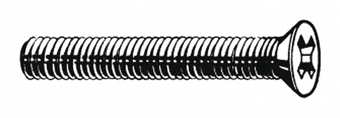 ' Machine Screw, Head Type Flat, Carbon Steel, Length 1-1/2", Drive Type Phillips, Finish Zinc Plated, Thread Size 3/8-16, Driver Size #4, Head Dia. 0.670", Head Height 0.200", Head Angle (Deg.) 82, Rockwell Hardness B70, Meets/Exceeds ANSI B18.6.3, Package Quantity 100 '