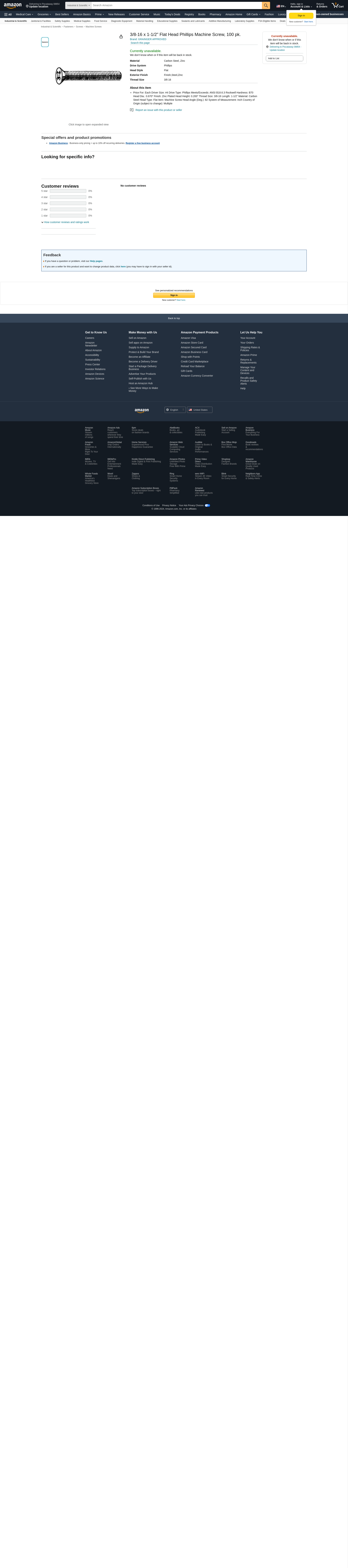 | Feature | Price For: Each Driver Size: #4 Drive Type: Phillips Meets/Exceeds: ANSI B18.6.3 Rockwell Hardness: B70 Head Dia.: 0.670" Finish: Zinc Plated Head Height: 0.200" Thread Size: 3/8-16 Length: 1-1/2" Material: Carbon Steel Head Type: Flat Item: Machine Screw Head Angle (Deg.): 82 System of Measurement: Inch Country of Origin (subject to change): Multiple |