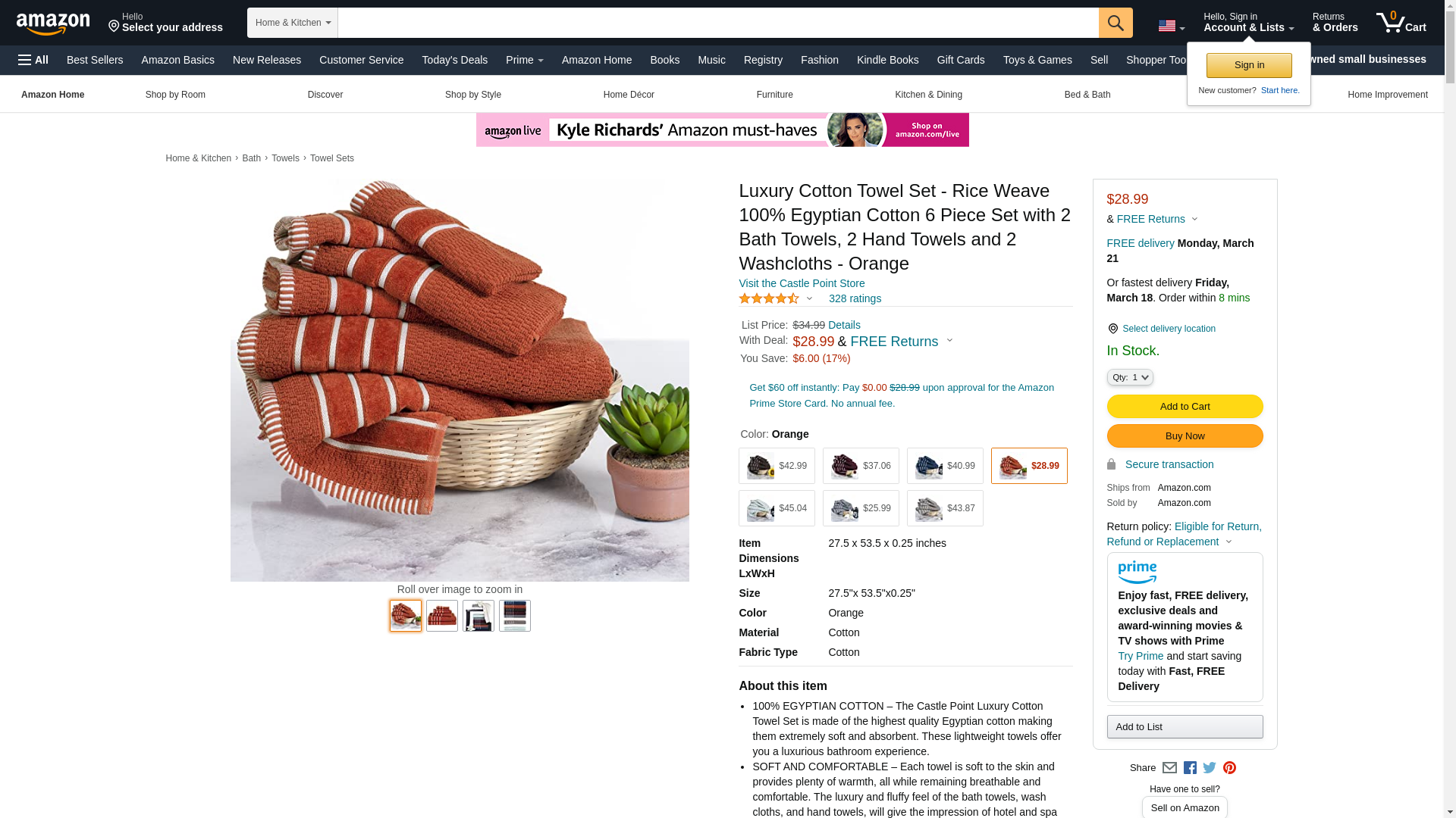 Luxury Cotton Towel Set - Rice Weave 100% Egyptian Cotton 6 Piece Set with 2 Bath Towels, 2 Hand Towels and 2 Washcloths - Orange