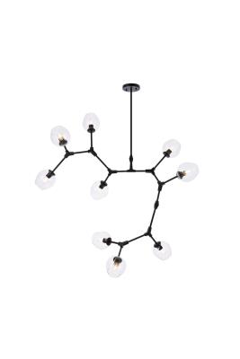 The daring Cavoli pendant lamp in a flat black finish is designed with 9 lights that connect at various angles, illuminating your rooms and ridding them of darkness. The winding paths end with a light encapsulated within a clear shade at each point. This contemporary blend of art and function results in this light that will shine beautifully in any space it adorns. black connectors supporting a path of flat black rods. Suspended from a flat black finish adjustable chain . Requires 9 E26 bulbs (bulbs not included). minimum hanging height is 40 inch; maximum hanging height is 74.5 inch. adjustable Rod up to 46 inch. Bulb wattage: 40W; Max wattage 360W. Fixture Material: Iron and Glass