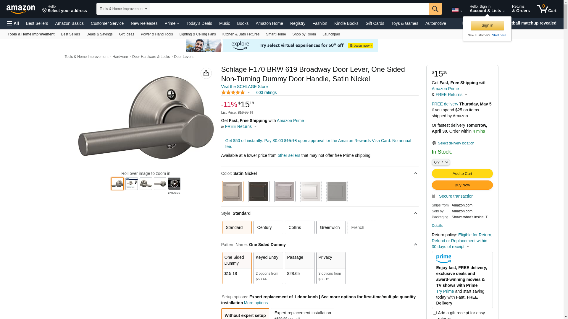 Schlage F170 BRW 619 Broadway Door Lever, One Sided Non-Turning Dummy Door Handle, Satin Nickel