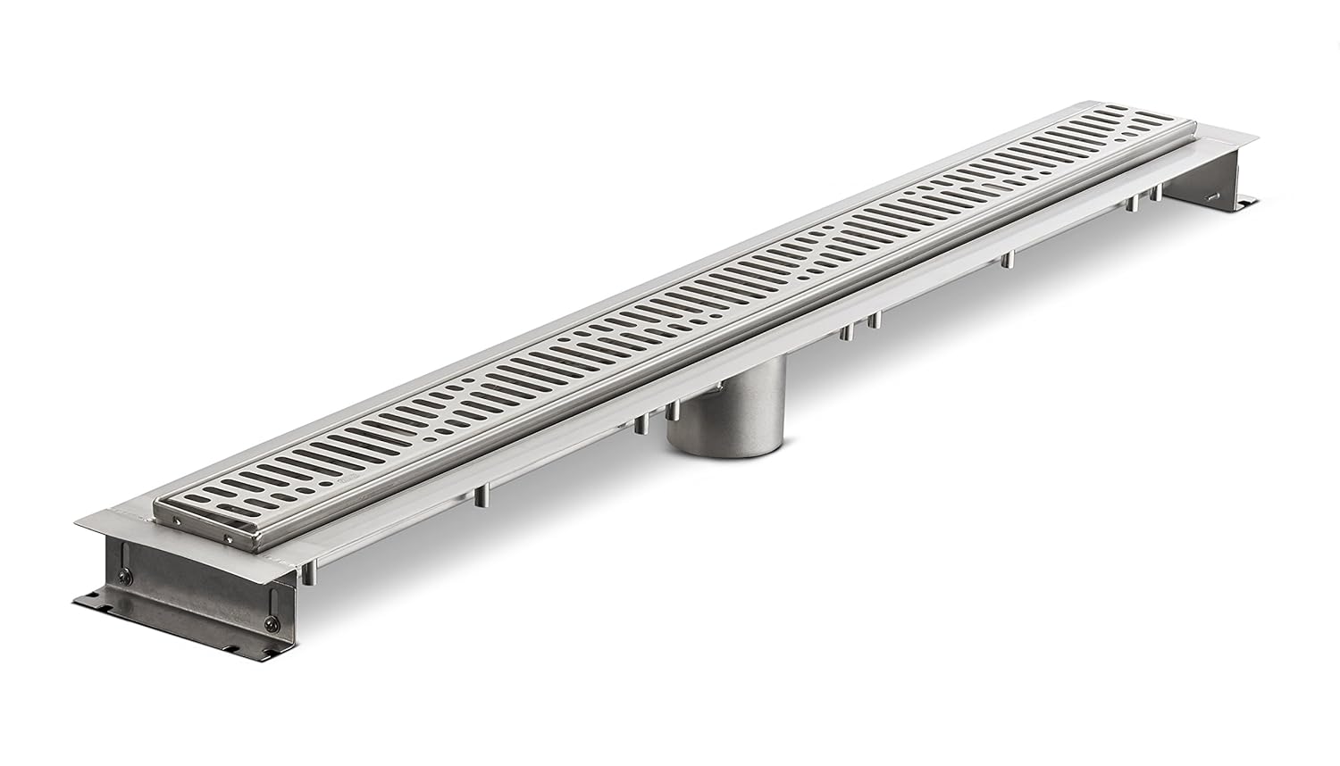 The 36-inch stainless steel trench drain features a slotted wave grate design ? ideal for applications where you want to impress, such as gyms, spas and hotels. Stainless steel construction enhances sanitation and ensures durability. Low-profile design with integral tilting edge allows for easy installation and quick adjustment. Innovative barrier-free drain provides heel-proof protection for alternative applications.