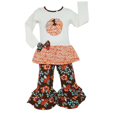 Cute hues of orange and brown make this AnnLoren outfit so pretty and special for the Thanksgiving Day celebration. The two piece set includes a skirted top with pumpkin patch and bow attached. The floral printed pants with flared cuffs complete the look. Suitable for young girls.<p>Country of Origin: USA or Imported