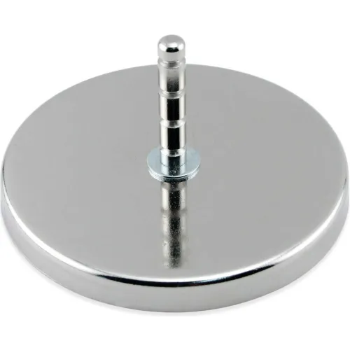 - Round base magnet fastener made of chrome plated steel cup containing Ceramic, Ferrite magnet with grooved steel post