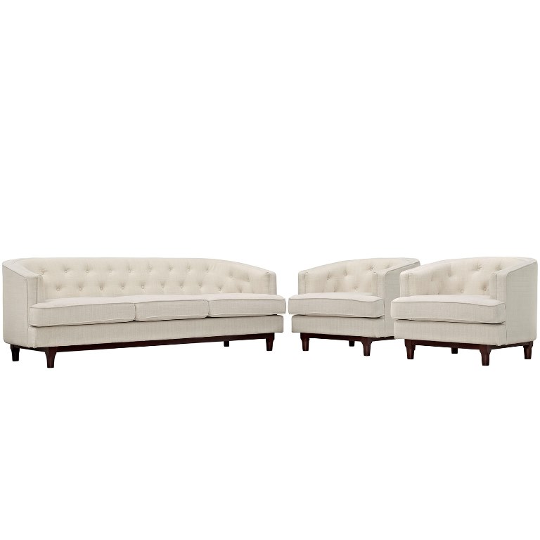 Modway Coast Upholstered Fabric Contemporary Modern Sofa and Two Armchair Set in Beige