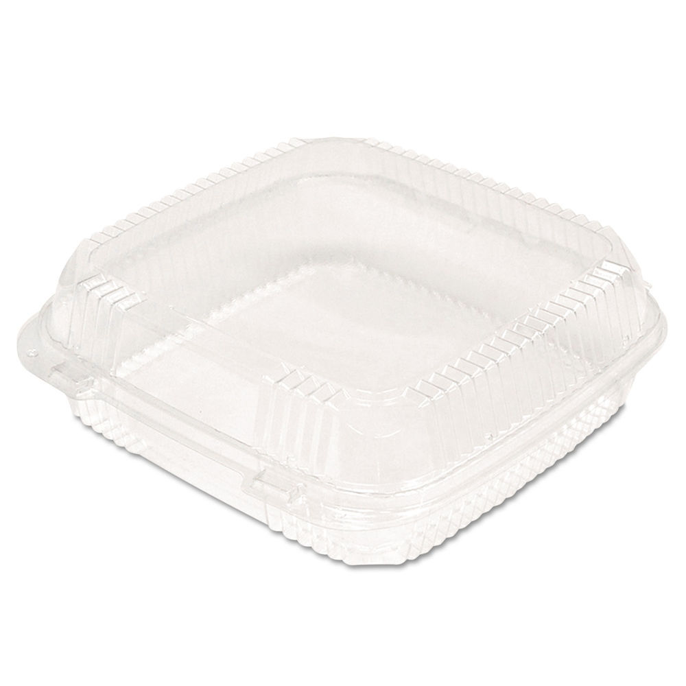 SmartLock system features a tight, audible click closure that helps ensure maximum food freshness. Wide temperature resilience range (20F to 180F) enables placement in freezers and heated display cases. Smooth front panel makes sticker-labeling easy. Strong, rib-reinforced sides and back accommodate heavy items and provide enhanced crush resistance. Break-resistant hinge is flexible enough for easy closure and reliable enough for repeated openings and closings. Food Container Type: Carryout; Material(s): Plastic; Color(s): Clear; Depth: 8 7/8".