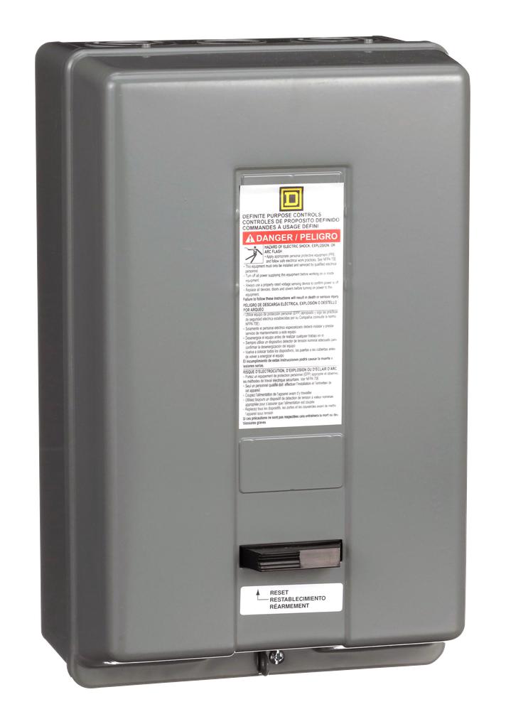 <br /><br /> Item: Definite Purpose Magnetic Motor Starter<br /> Number of Poles: 2<br /> Amps AC: 50<br /> Coil Volts: 240VAC<br /> Enclosure NEMA Rating: 1<br /> HP @ 1 Phase - 120V: 3<br /> HP @ 1 Phase - 240V: 10<br /> Action: Nonreversing<br /> Hz: 50/60<br /> Height: 10.00"<br /> Width: 6.00"<br /> Depth: 4.00"<br /> Standards: UL File E3190 CCN NLDX2/ CSA<br /> Includes: Melting Alloy Overload Block and Trip-Free Reset Mechanism