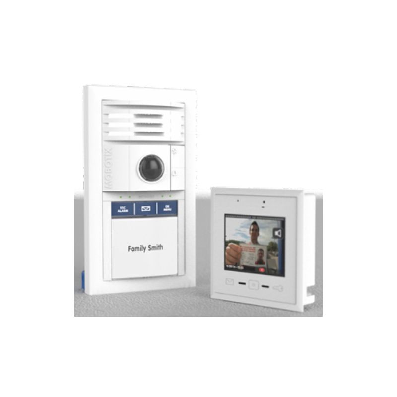 T25 IP Video Door Station with MxDisplay+ as preconfigured complete set for use in family homes Delivery outdoor remote station (IP65, -30 to 50°C , -22 to 122°F): CamCore T25 with 6 Megapixel Moonlight Sensor, color (day) and Fisheye Lens B016 (focal length 1.6 mm, f/2.0, 180° x 180°) BellRFID module with one big key with blue functional bar, 1x admin and 6x user card, MX-OPT-IO2 Ethernet board, double frame set for in-wall or on-wall installation, pen for plastic film, mounting material Delivery indoor remote station: MX-DISPLAY3, FlatMount Frame with In-Wall-Housing All devices and frames colored in white