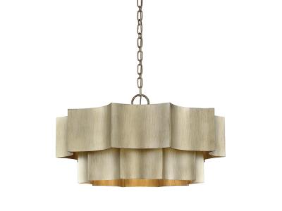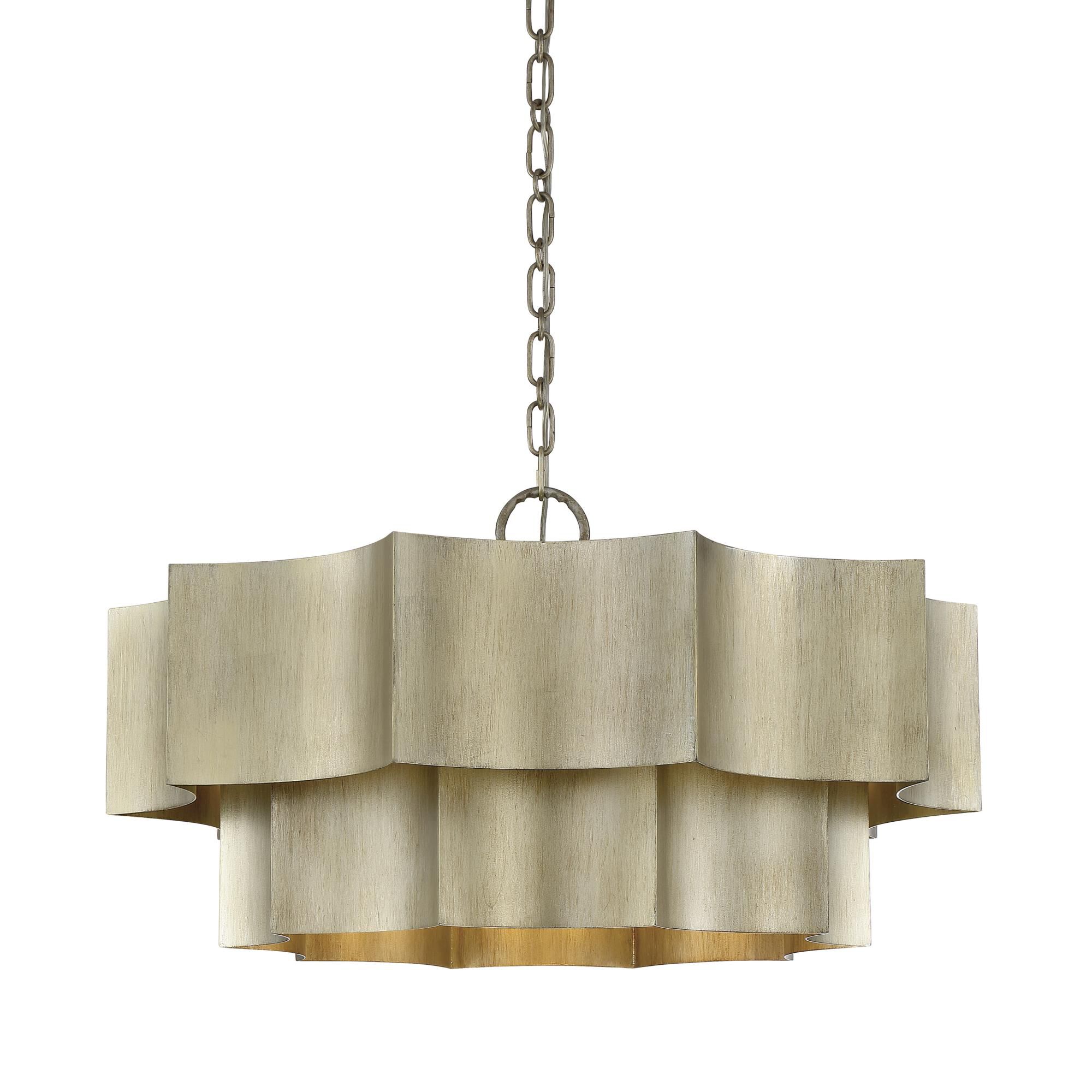Doubling the wow factor of the original 3-light Shelby pendant, this 6-light version from Savoy House features two stacked bands of delicately crimped silver patina finished metal hanging from a single silver chain. Alluring, upscale and completely unique, this simple yet striking contemporary light fixture is appropriate for almost any spot in the home. It's a break from tradition in kitchens and dining rooms, and a welcome surprise as bedroom, entry or bath lighting. Compatible with transitional, contemporary and mid-century modern interiors, the Shelby pendant light is also perfect for pairing with contrasting metals like brass cabinet hardware and bronze photo frames to easily achieve today's popular mixed metal decorating trend.