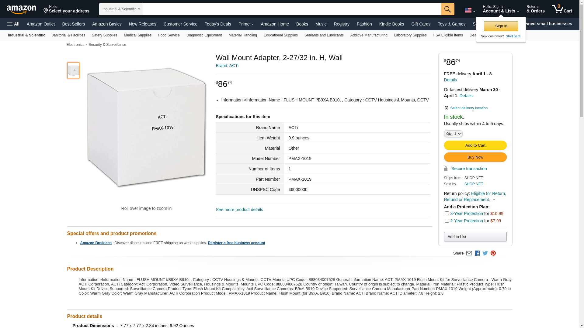 Information >Information Name : FLUSH MOUNT f/B9XA B910, , Category : CCTV Housings & Mounts, CCTV Mounts UPC Code : 888034007628 General Information Name: ACTi PMAX-1019 Flush Mount Kit for Surveillance Camera - Warm Gray, ACTi Corporation, ACTi Category: Acti Corporation, Video Surveillance, Housings & Mounts, Mounts UPC Code: 888034007628 Country of origin: Taiwan. Country of origin is subject to change. Product Type: Flush Mount Kit Device Supported: Surveillance Camera Product Type: Flush Mount Kit Compatibility: Acti Surveillance Cameras: B9xA B910 Device Supported: Surveillance Camera Manufacturer Part Number: PMAX-1019 Weight (Approximate): 0.79 lb Manufacturer: ACTi Corporation Product Model: PMAX-1019 Product Name: Flush Mount (for B9xA, B910) Brand Name: ACTi Brand Name: ACTi Diameter: 7.8 Height: 2.8 Product Color: Warm Gray Product Color: Warm Gray Product Material: Iron Product Material: Plastic
