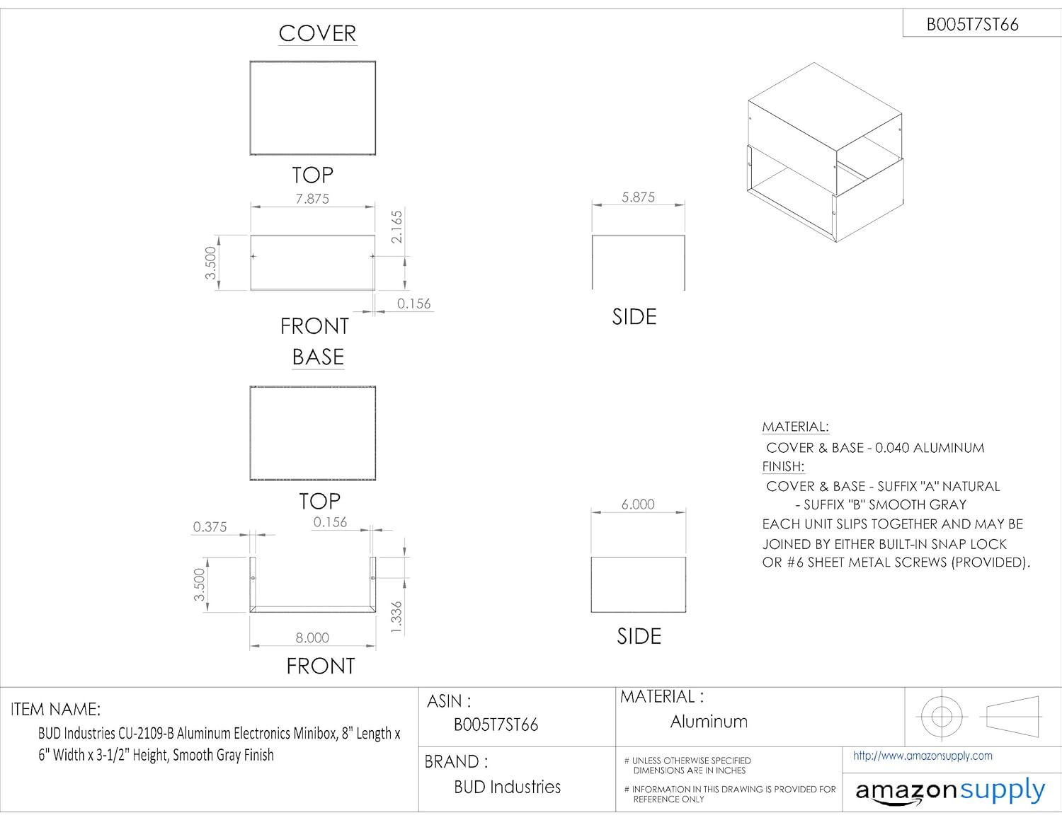 BUD Industries CU-2109-B Aluminum Electronics Minibox 8" L x 6" W x 3.5" H, Gray
