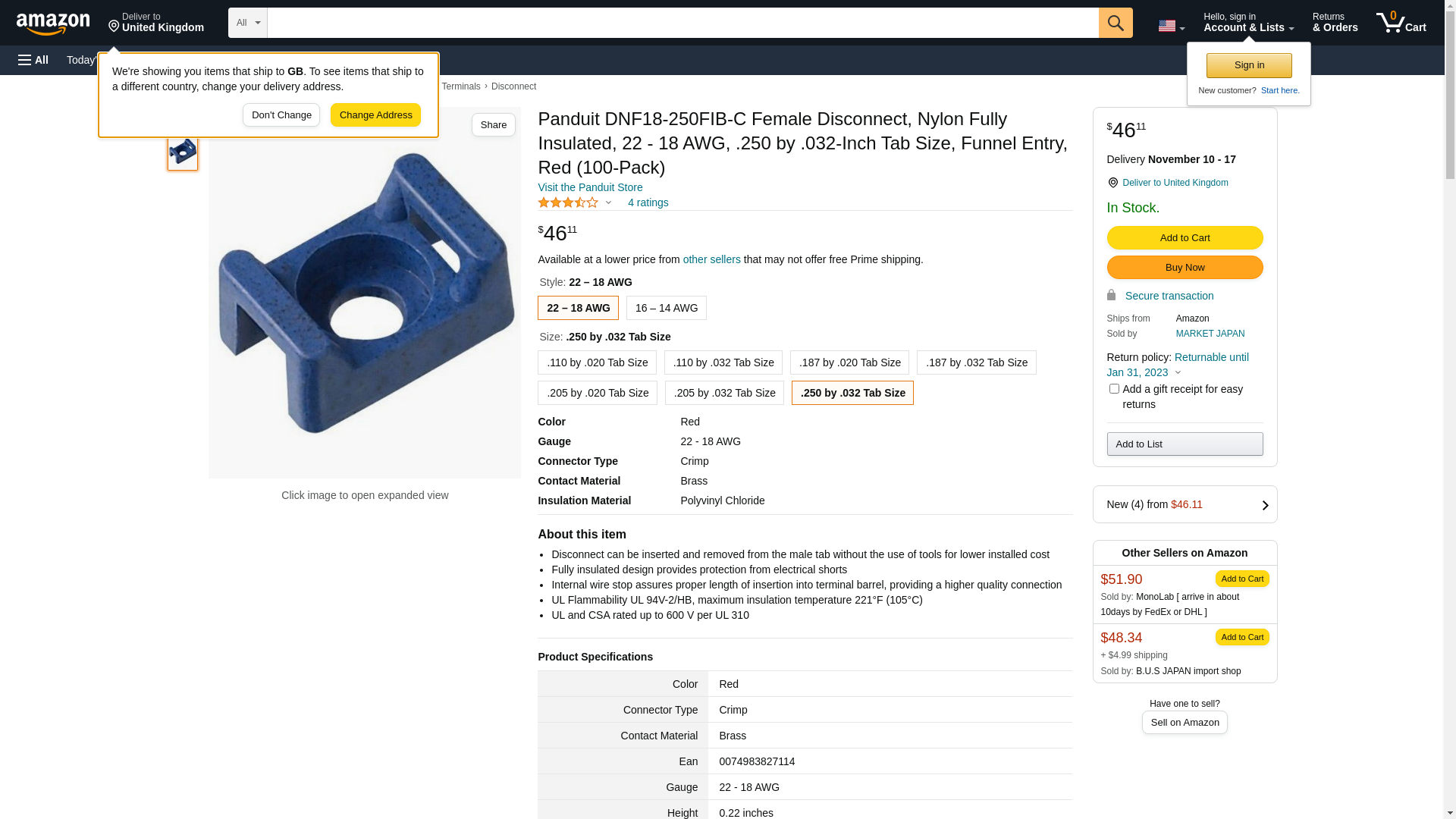 Panduit DNF18-250FIB-C Female Disconnect, Nylon Fully Insulated, 22 - 18 AWG, .250 by .032-Inch Tab Size, Funnel Entry, Red (100-Pack)