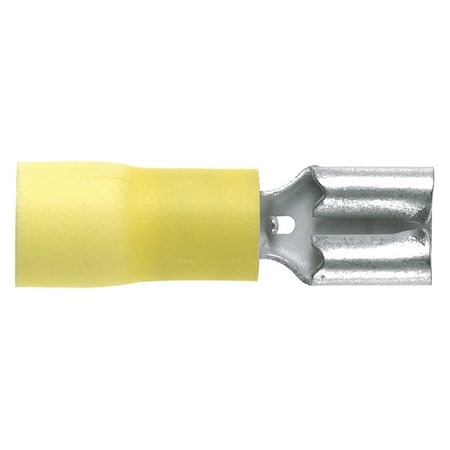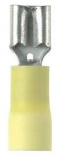 | Feature | <b>Price For:</b> Each <b>Type</b>: Quick Disconnect Terminal <b>Gender</b>: F <b>Termination Method</b>: Crimp <b>Tab Size (mm\xb2)</b>: 5.16 <b>Body Orientation</b>: Straight <b>Plating</b>: Tin <b>Wire Size (AWG)</b>: 10-12 <b>Maximum Voltage Rating</b>: 600V <b>Maximum Operating Temperature (\xb0C)</b>: 90 <b>Insulation</b>: Vinyl <b>Product Length (mm)</b>: 26.16 <b>Product Depth (mm)</b>: 7.62 <b>Tab Dimensions (mm)</b>: 6.3x0.8 <b>Color</b>: Yellow |