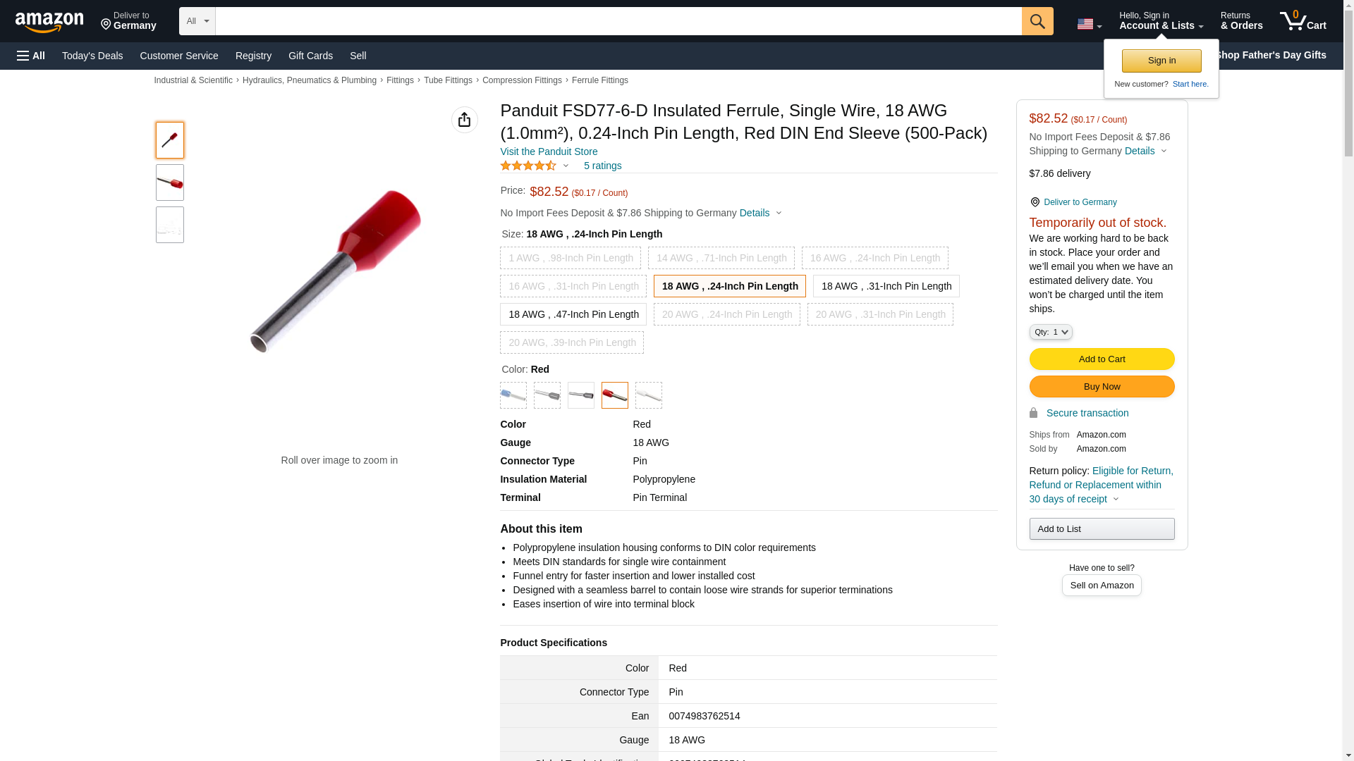 Panduit FSD77-6-D Insulated Ferrule, Single Wire, 18 AWG (1.0mm²), 0.24-Inch Pin Length, Red DIN End Sleeve (500-Pack)